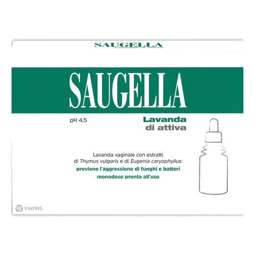SAUGELLA pH 4,5 lavanda di attiva Dispositivo Medico CE. Lavanda vaginale a base di estratto di Thymus vulgaris ed Eugenia caryophyllus a pH 4,5. Estratti con attività antimicotica. Lavanda monodose, pronta all'uso. L'attività inibente degli estratti è dovuta alla loro capacità: - di ridurre l'adesione di funghi e batteri (Escherichia coli, Staphylococcus aureus e Candida albicans) alle pareti vaginali; - di indurre alterazioni morfo-strutturali della Candida albicans. L'attivita antiadesiva avviene a concentrazioni inferiori alla MIC, minima concentrazione inibente, concentrazione che inibisce il 90% dei germi. L'attività e...
