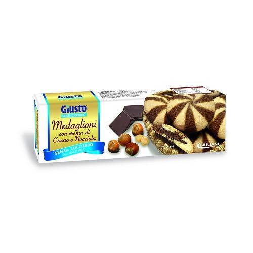 Vedi descrizione completa Giusto SENZA ZUCCHERO Medaglioni ripieni Cacao e Nocciola Prodotto senza zuccheri aggiunti. Può contenere tracce di